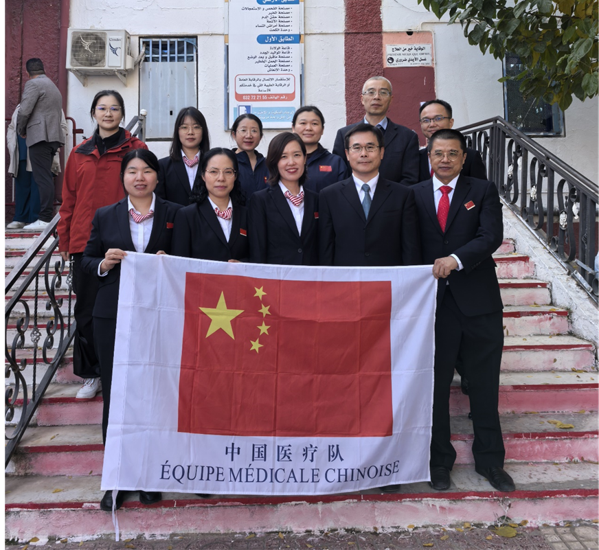(陈忠参赞与援阿医疗队巴特纳分队队员合影)