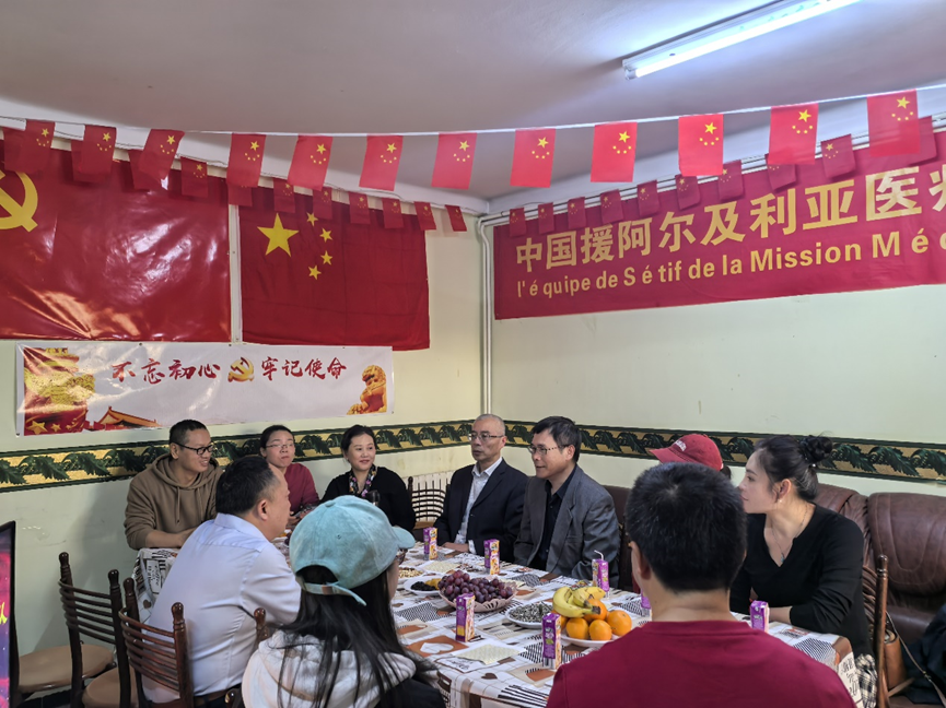 (陈忠参赞与援阿医疗队塞蒂夫分队队员座谈)